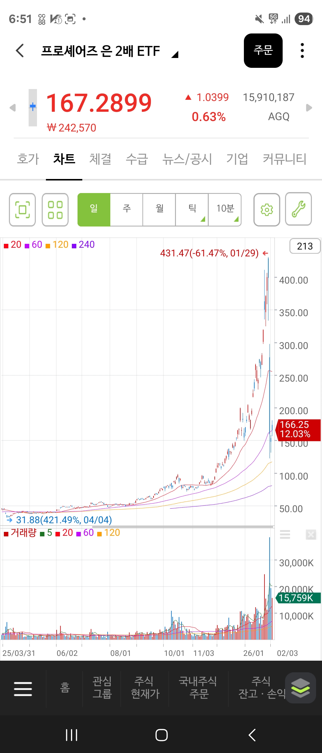 은값폭락 이후 반등모습이 보였고 매수가능성을 고려했었다. 2배를 집어들었고, 살짝 내려가는것을 보고 무서워서 바로 내려놓았다. 이는 잘한행동, 혹은 느린 행동이었다. 이또한 무지성 감성매매의 위험한 시도였던것같다. 은섹터는 관심도없었고 알지도못한다. 그래서 단지 내렸으니 오르는 흐름을 타볼까?하는 생각이었다. 물론 발에서 샀다면 좋았겟지만 누구도 그러지 못한다는것을 익히 들었고 경험했기에 안다. 그래서 오르는 분위기에서 올라탈까 했지만 애초에 분위기는 형성되지도 않았다. 이것은 무서움에 내렸고, 아주잘한 선택이었다고 본다.