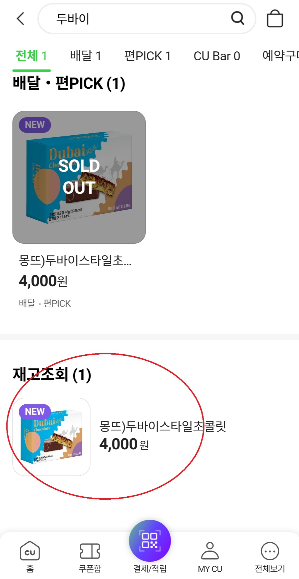 편의점명칭출시일사전예약일가격구매/예약/재고조회특징CU 두바이 스타일 초콜릿 `24.07.06.X4,000원포켓CU 재고조회- 카다이프 대신 한국식 건면을 사용- 국내 기업과 협업 - 재고 지속 생산중GS25두